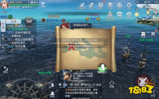我们可以在包中点击并使用地中海藏宝图,使用后将会接取一个限时10分钟的寻宝任务,并给我们一张寻宝地图。我们可以根据寻宝图指示的方位来到海域中相同的位置进行寻宝,也可以交由电脑自动寻路挂机完成。完成寻宝后可以获得银币、紫色船首帆图纸、紫色船甲图纸、紫色魂石等丰厚奖励,非常推荐大家在空闲时挂机完成。