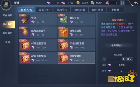在商场充值购买也是一种快速获得各种资源的方法。其中,地中海藏宝图可以在钻石商店中通过购买国家宝藏礼获得。国家宝藏礼包的价格为1380钻,每周限购1个,使用后可获得4个国家宝藏奖券、10个地中海藏宝图以及三张不同的紫色藏宝图,我们可以根据自身情况酌情购买。