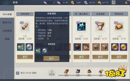 同业委托是每日活动中最基础的一项单人活动,其中包含五个任务,奖励逐级递增,进行任务的时候有概率触发隐藏任务,完成后可获得紫色藏宝图。同业委托的任务十分简单,且可以通过电脑挂机自动完成,但是触发隐藏任务的概率较低。我们可以每天闲暇时挂机完成任务,触发任务并获得紫色藏宝图往往在不经意之间。
