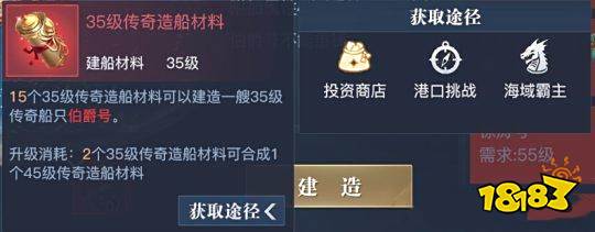 在投资商店中,达到一定的投资额度后就可以购买启航宝箱,启航宝箱lv3和启航宝箱lv4中各有1个传奇造船材料,启航宝箱需要花费贸易币购买,从启航宝箱中可以获得2个35级传奇造船材料。
