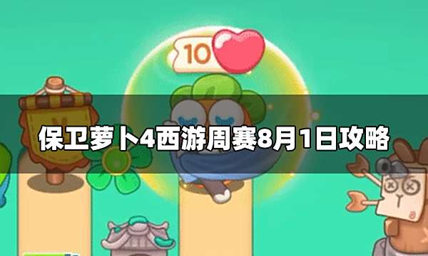 保卫萝卜4周赛8月1日通关方法是第一步开局的三级毒针可以完美解决第一波滑板兔,用雷达锁定这个酒桌,如果雷达暴击的话就会快点,没有暴击也差不多,打掉后暂停放雷达,并锁定这个桃子,等第一只兔子到这个位置的时候集火打掉,可以节省时间。