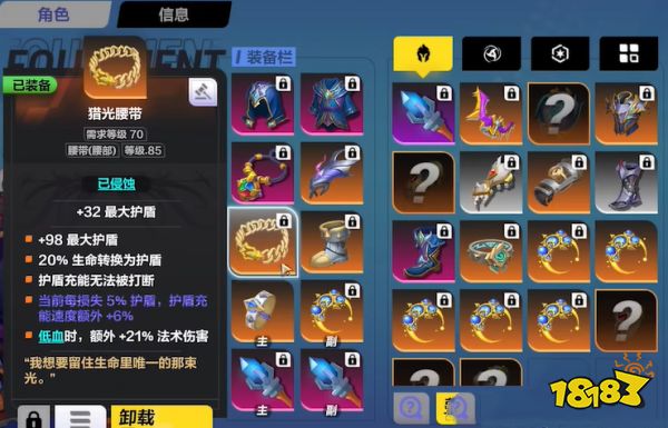 猎光腰带的主要能力是可以价格生命值转化为护盾,而每损失5%的护盾就会获得6%加成的护盾充能速度,另外在血量低于21%时可以增加21%的法术伤害。