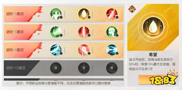 3、三进阶潜能与攻击型格斗家类似,只是将“背水”换成了“连击”,使用普攻时,回复100怒气,建议选择“连击”提升一点输出能力。