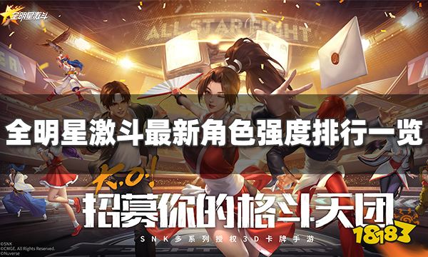 全明星激斗角色强度排行T0角色神乐千鹤、娜可露露、八神庵,T0.5角色克里斯、霸王丸、枫、库拉,T1角色李烈火、玛丽、幻十郎、橘右京、嘉神慎之介、不知火舞、安迪、御名方守矢、觉醒八神庵、K、草薙京等等。