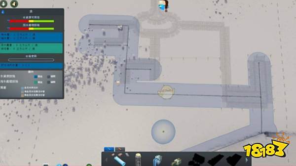 9.然后我们必须将水管铺设到城市内供市民与建筑使用,在前面用水管连接的时候应该可以发现,水管会展开一个淡蓝色的范围,而在这个范围内的任何建筑都可以受到水的输送与排放,因此不需要将水管紧邻着铺设。