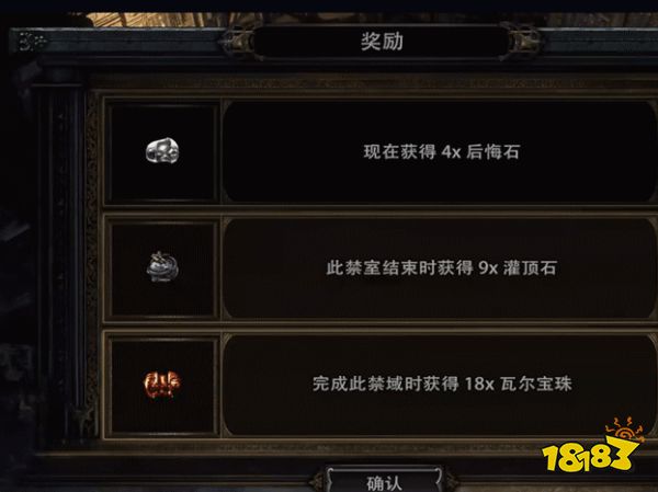 为你提供货币物品。你可以立即将奖励收入囊中,或者将它留下,稍后换取更为丰厚的奖励。你可以将奖励推迟到当前楼层甚至整个禁域结束,这会带来巨大的风险。如果你在达成目标前就耗尽了坚毅,那么押注的所有物品都会丢失。你相信自己有本事冒这个险,为巨大的奖励放手一搏吗?还是说保险起见,落袋为安呢?