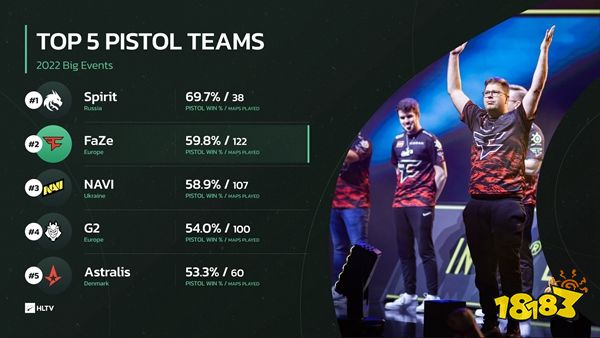 HLTV今日盘点了2022年大赛中手枪局胜率最高的队伍,其中Spirit凭借69.7%的胜率排名第一。剩下的几个队伍也都是经典的手枪局强队,他们分别是FaZe、NaVi、G2与Astralis。