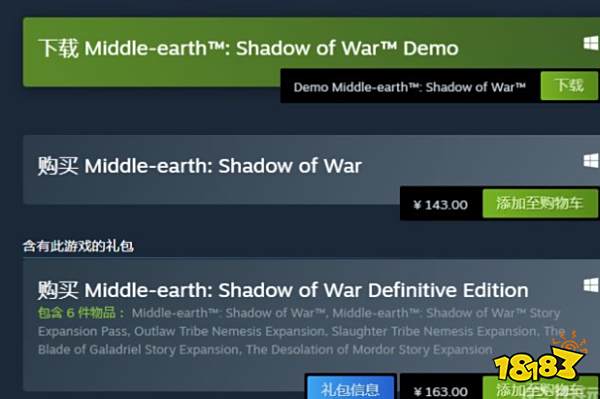中土世界:战争之影标准版售价为143元人民币,终极版售价为163元人民币,大家可以等有打折优惠的时候参考入手。