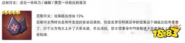 魔灵召唤克罗尼柯战记忍耐符文能增加效果抵抗,两件套即可产生套装效果:效果抵抗增加15%,适合体力型或者辅助型魔灵。