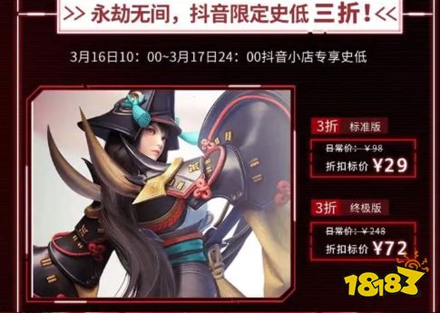 永劫无间3折是要去都有官方小店购买的,时间是3月16日10:00至3月17日24:00,现在前往抖音搜索永劫无间超级品牌日,就能在首页看到直播间,有需求的快前往购买吧!