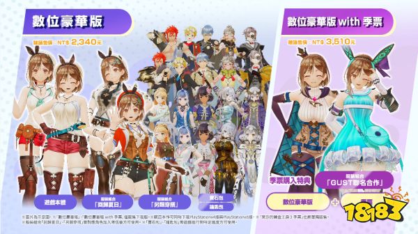莱莎3豪华版包含游戏本体、服装组合“回归夏日”和“另类穿搭”、宝石包和钥匙包,其中季票购入特典还包括“GUST联名合作”服装组合,具体内容及其售价见下文。