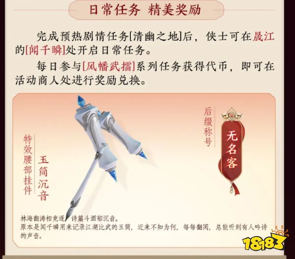 剑网3无名客后缀称号的获取方法是每日参与风幡武擂系列任务获得代币,然后在活动商人处进行奖励兑换。系列任务需要完成预热剧情任务“清幽之地”,才可在闻千瞬处开启。