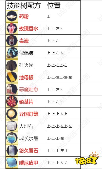 莱莎的炼金工房3技能树配方有毒液、玫瑰药水、创生铁矿、悠久磐石、恶魔吐息等等,它们在技能树所处的位置都不一样,玩家可按照下表指示的位置来选择前期先开发的技能树方向。