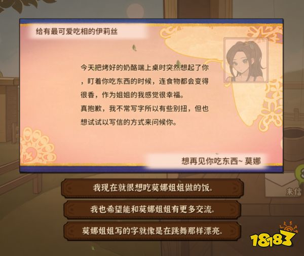 火山的女儿莫娜的信第一封要回我也希望能和莫娜姐姐有更多交流,第二封回下次也让我一起烹饪吧,第三封回我会认真度过每一天的。