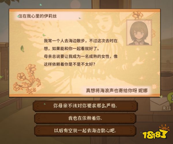 攻略对象达到一定好感,女儿会收到他们的来信,一般会有两封信件,也有只含一封的,不同的回复选项增加的好感值不同,最佳选项能增加4点好感值。