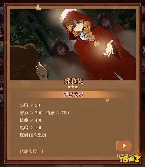 邪教徒结局的达成条件是头脑≥50,智力和情感≥700,信仰≥400,黑暗≥100,探索10次黑街。