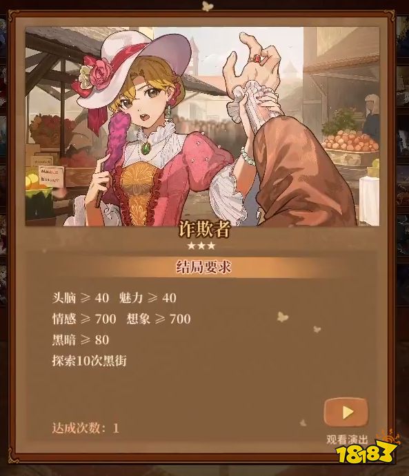 诈欺者结局的达成条件是头脑和魅力≥40,情感和想象≥700,黑暗≥80,探索10次黑街。