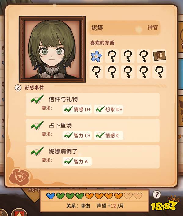 2、完成全部好感事件至少得关系达到挚友,智力达到A,情感达到C,想象达到D+