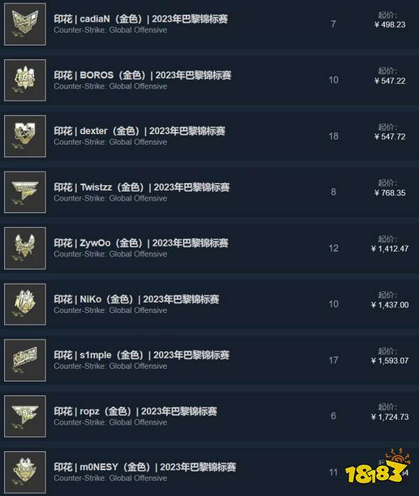 至于选手贴纸,价格最贵的是Ilya Osipov|m0NESY。目前他的金贴价格是2418元人民币,在狙击手贴纸价格排行中m0NESY超越了s1mple(1593)、ZywOo(1412),紧随其后的cadiaN金贴价格骤降,只有500元左右。