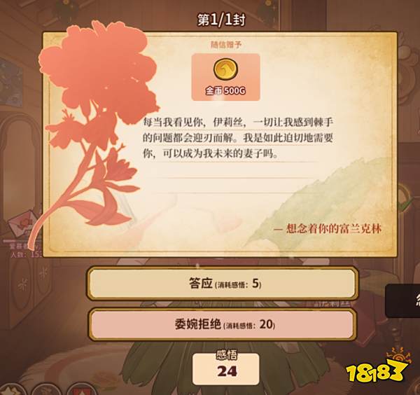 情书答应不会影响女儿的最终情感结局,能拿到随信附赠的500块金币,但会增加2点黑暗。