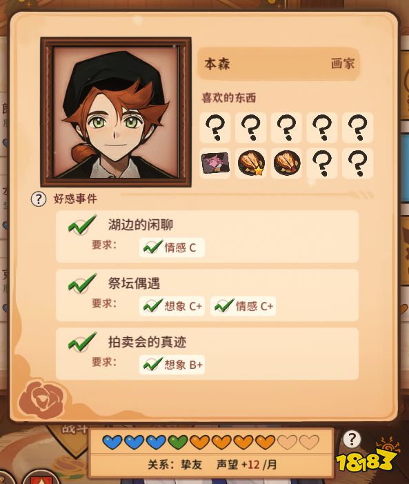 2、完成本森的三个好感事件,想象B+和情感C+以上才能触发全部事件
