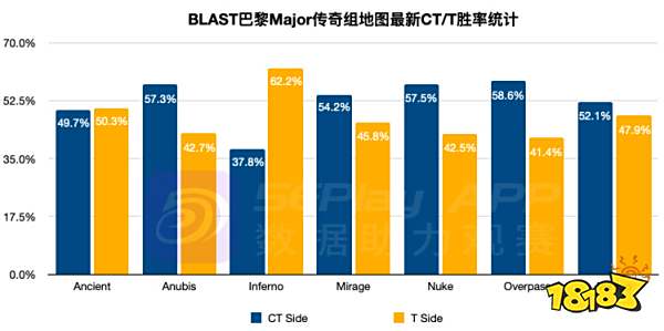 Anubis当前仍然是出场率最低的一张地图,巴黎Major传奇组比赛至今,Anubis仅仅出场4次,但在CT/T的胜率统计方面,Anubis已经以57.3%的CT胜率成为一张防守明显优势地图,在所有比赛地图中排名第三。另一方面,除去胜率接近平衡的Ancient,Inferno则是当前T方进攻绝对优势的地图代表,在已结束的8场传奇组比赛中,Inferno的T方胜率已经高达62.2%。