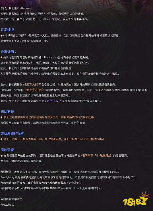 地狱有什么不好最新消息显示,开服时间将推迟两个月,也就是7月29日才会开服,不过好消息是预约上架平台新增了EROLABS,安卓的国服玩家也能顺畅下载,不用去谷歌商店找了!