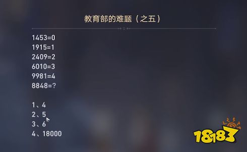 崩坏星穹铁道教育部的难题之五答案是3、6,因为四个数字看成一个整体,数里面有几个圆圈,1453没有圆圈等于0,6010有3个圆圈等于3,8848有6个圆圈,答案就是6。