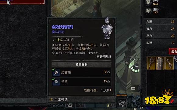 3、点击制作弱效铁刺药剂即可,药水持续30分钟,能够提高获得的经验值5%