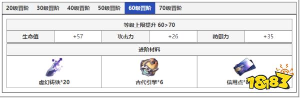 60级晋阶材料:虚幻铸铁*20 + 古代引擎*6 + 信用点*80000