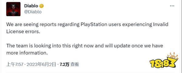 大致翻译:我们看到了关于PlayStation用户遇到无效许可证错误的报告。团队正在调查此事,一旦有更多信息,我们会及时更新。