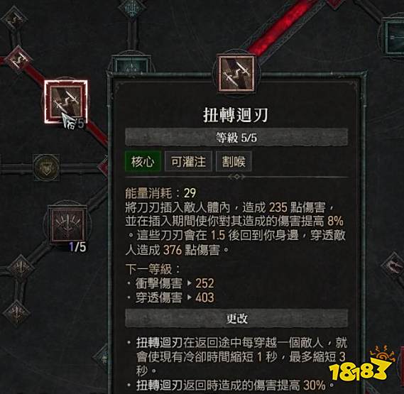 分支选择强力回旋刀锋,这个分支每命中一名敌人,就可以减少所有技能的冷却一秒,最多减少3秒,能提升灌注类技能发覆盖率和大招的使用频率