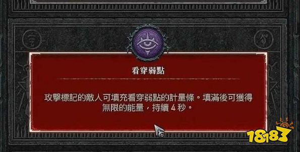 一定选第二专精「看穿弱点」,系统会自动标记随机的一名敌人,攻击该敌人可为专精充能,触发之后就可以获得4秒的无限能量;该专精没有CD,所以可以持续填充能量和触发。