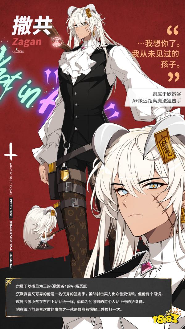 4、撒共是A+级远距离魔法狙击手,隶属于以撒旦为国王的欣嫩谷地区,沉默寡言又可靠,射击实力出众备受信赖,喜欢为遇到的每个人贴上他的贴贴纸护身符。