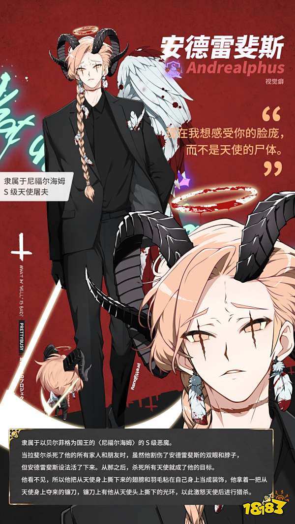 12、安德雷斐斯是S级天使屠夫,隶属于以贝尔菲格为国王的尼福尔海姆地区,他的双眼和脖子被拉斐尔割伤了,但是设法活了下来,从此杀死所有的天使是他的目标。