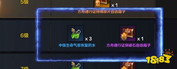命运方舟通行证奖励选第二行的比较好,是我们目前提升装分最重要的东西,比如进入T3的材料,一个突破石交易行卖60金,第一行给的基本是英雄好感度、生命七级药水以及日常委托等东西,获取后直接扔仓库。