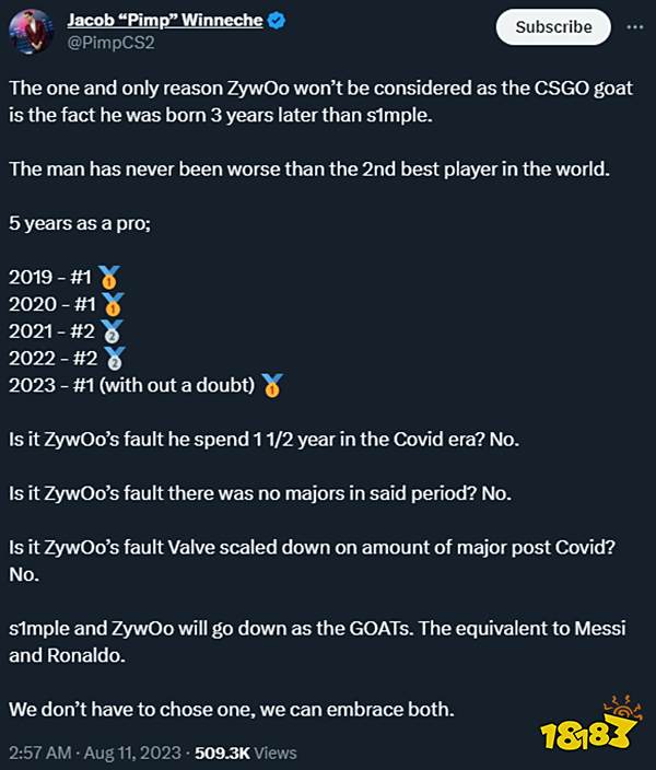 Mathieu Herbaut|ZywOo的职业生涯里有一年半的时间处于疫情时期,这是他的错吗?不是。那段时间Valve没有举办Major,是不是ZywOo的错?疫情结束之后Valve减少了Major的数量,是不是ZywOo的错?不是。Oleksandr Kostyliev|s1mple和ZywOo将被视为CSGO的GOAT选手,就像梅西和C罗纳尔多一样。我们没有必要非要选择一个,可以同时选择他们两个。”