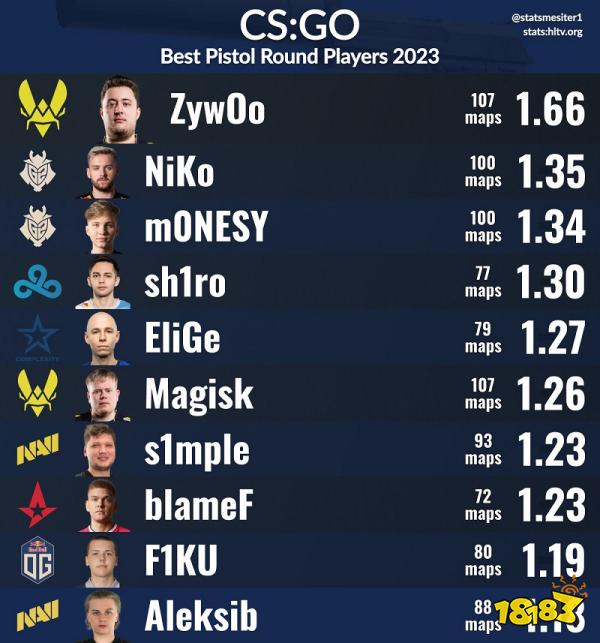 CSGO爱好者statsmeister跟据HLTV数据统计了2023手枪局发挥最好的十位选手,Mathieu Herbaut | ZywOo以107张地图,1.66 rating登顶第一!Nikola Kovač | NiKo与Ilya Osipov | m0NESY紧随其后,两人以1.35 rating与1.34 rating分列第二、第三。