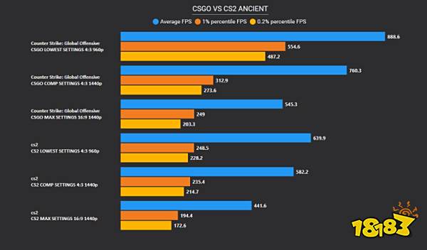 而在地图Ancient上,该网友再次进行了三种设置下对CSGO与CS2进行帧数对比,分别是最低画质设置,普通画质设置,最高画质设置。最高画质下,CS2的平均帧数达到了441.6 FPS,最低帧数为172.6 FPS。