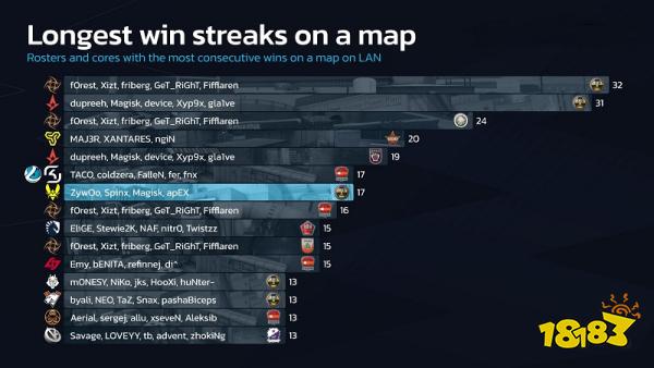 从图中可以看到,当年f0rest、GeT_RiGhT带领的老Ninjas in Pyjamas曾在Nuke创下32场不败佳话,而曾经叱咤风云的老Astralis只差2场就能打破这一伟大纪录。不得不说,NIP在榜单上出现了4次为所有队伍之最。