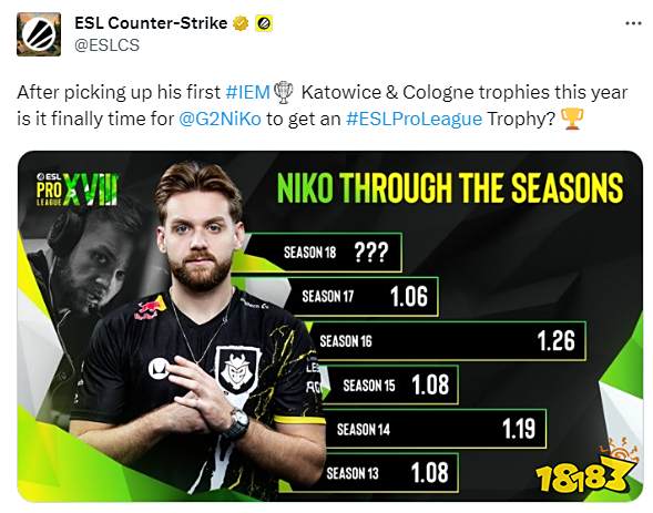 今日赛事主办方ESL在社媒平台上发出疑问:“在今年连续斩获IEM科隆和IEM卡托两座重量级的冠军奖杯之后,Nikola Kovač | NiKo是否能在EPL S18上更进一步?获得职业生涯首座EPL系列赛事的冠军?”并附上一张NiKo历届EPL赛事Rating数据图。