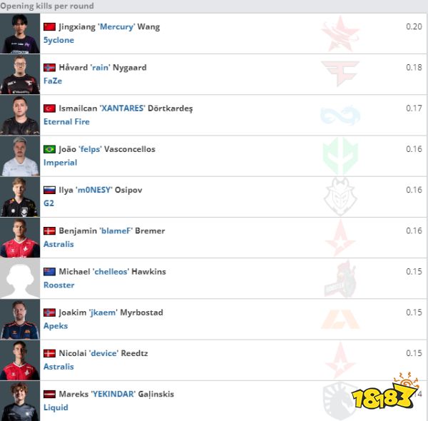 值得一提的是,在如今主流战术风格越来越保守的情况下,狙击手并不会是队伍中尝试首杀最多的人,往往突破手或者主点的CT是第一个和对手交火的人,这个榜单中有我们熟悉的突破手rain、XANTARES、jkaem、YEKINDAR,不过汉堡还是凭借自己精湛的枪法,和更多的首杀排到了榜单第一。