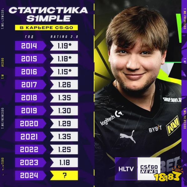 截至目前s1mple在2023年的Rating为1.18。只比2016年的1.15表现略好,不过当时统计数据是使用不同的公式计算的(2017年的时候HLTV才引入rating 2.0系统,部分页面数据依旧以1.0计算,因此前几年数据略有出入)。s1mple最好的数据年份是2018和2021年,他取得了1.35的Rating。