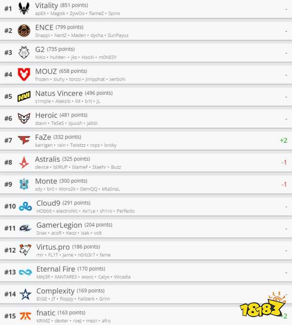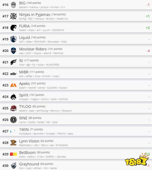 11-20名中fnatic、FURIA和Ninjas in Pyjamas排名小幅度上升,Movistar Riders战队排名下降四名。