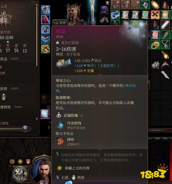 2、悼霜是珍奇级超强力法杖,在冰霜伤害+1的同时,有概率施加一个冰霜伤害翻倍的超强debuff,还附带一个冰霜戏法,最最重要的是它超级好看。