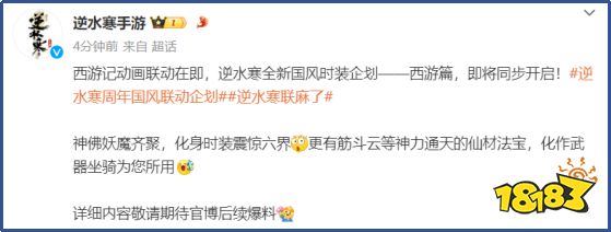 4)更多联动:官方推文表示会有西游法宝和大圣的筋斗云降临逆水寒!参考珍妮最新微博,话语中透露了联动会有筋斗云系列坐骑和武器外观:更有筋斗云等通天神力的仙材法宝,化作武器坐骑为您所用。