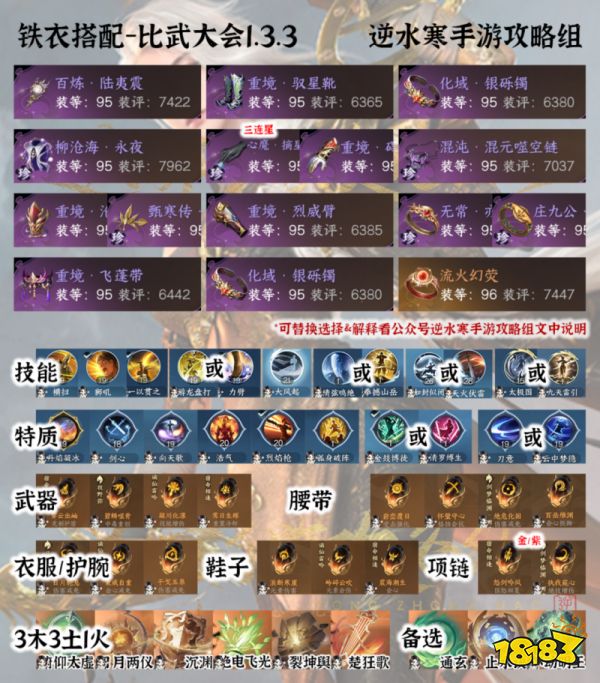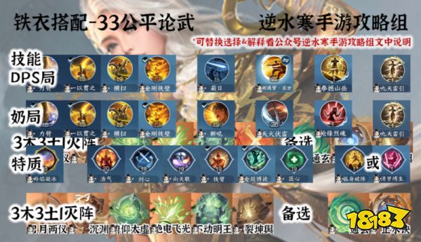 技能:当前版本铁衣输出能力也不错。横扫狮吼跟一贯保证我们的输出,力劈跟游龙盘打根据操作习惯选择。大风起保证队友生存。群侠选择清弦鸣绝补充控制也可以选择岳飞保证生存。如封似闭打对面双远程。绝技选太极图偏辅助,九天雷引能刷也能打击杀。当前版本由于岳飞群侠的存在并不好强行打击杀所以不推荐带夺魄。