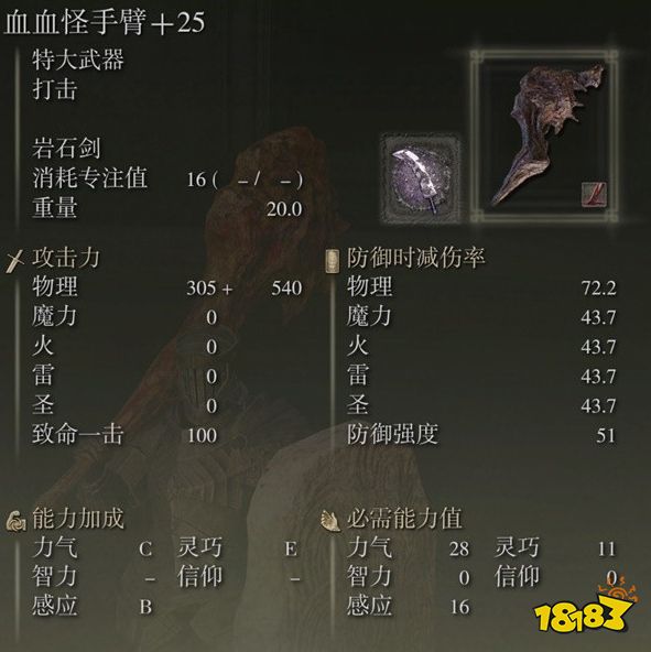 右手带血血怪手臂,是这个流派的核心武器,使用岩石剑战灰与血质变,因为武器的重击自带出血效果,因此有了血质变的血血怪手臂除了高削韧还拥有了高出血的特性。