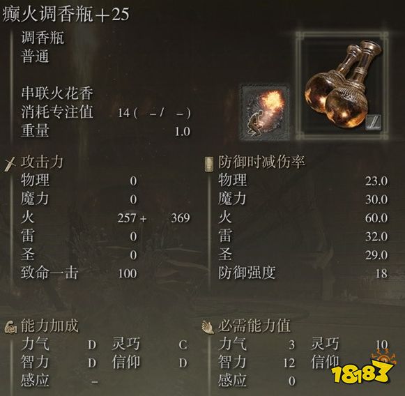 通过癫火调香瓶的补正与必须能力值来看,这套流派没有严格的加点朝向,因此我个人建议主灵巧可以高一些,副加信仰与感应,除了调香瓶的战技攻击使用大量的祷告攻击为辅助。