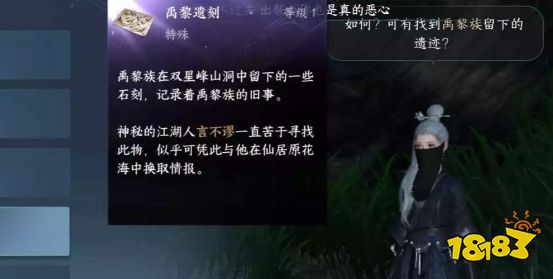 2、接着,带着【禹黎遗刻】前往仙居原,找到NPC言不谬(坐标:870,8831),与他对话并将【禹黎遗刻】出示给他。